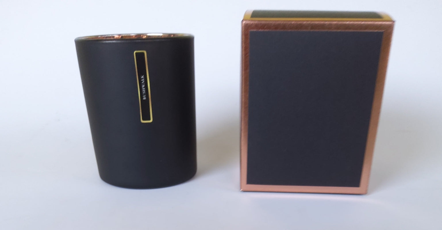 Coco soy candle with cotton wick. Aromas of the Australian bush. Imagine walking in the Australian bush, blue skies above, listening to the birds singing. Aromas of lemon myrtle, eucalyptus and patchouli. Elegant black matt ceramic vessel, rose gold interior. Holds 320g wax with approximately 40 hours burn time. Comes with matching black and gold box.