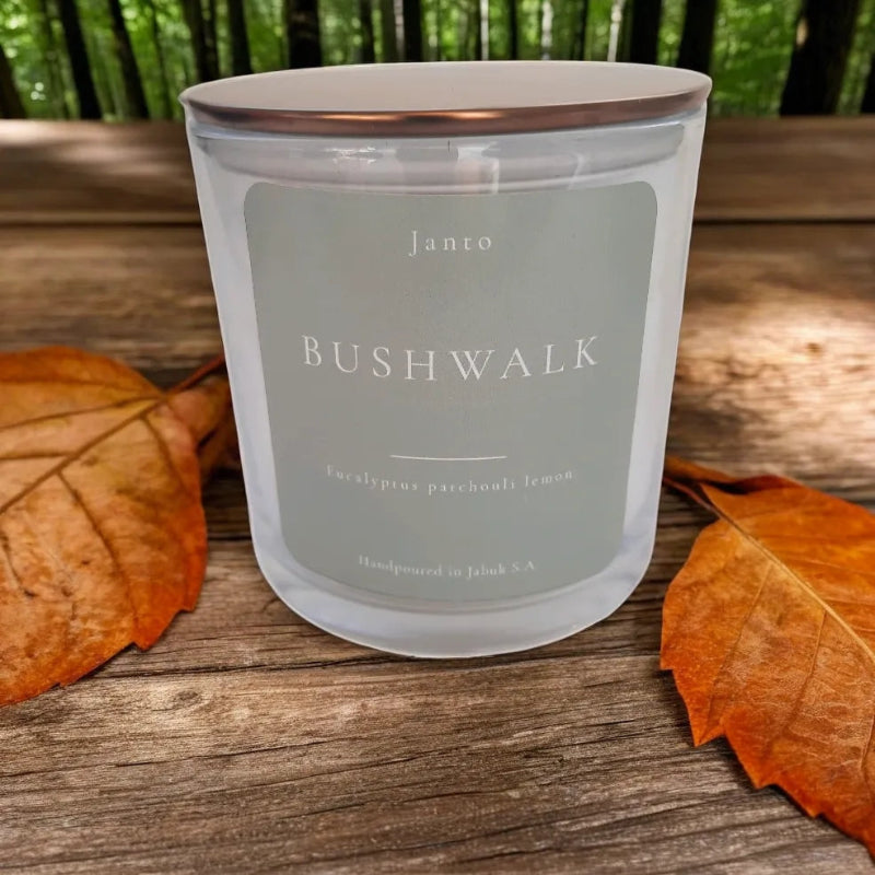Coco soy candle with 2 cotton wicks. X large glass container with gold lid. Aroma of the Australian bush. Lemon myrtle, eucalyptus and patchouli.