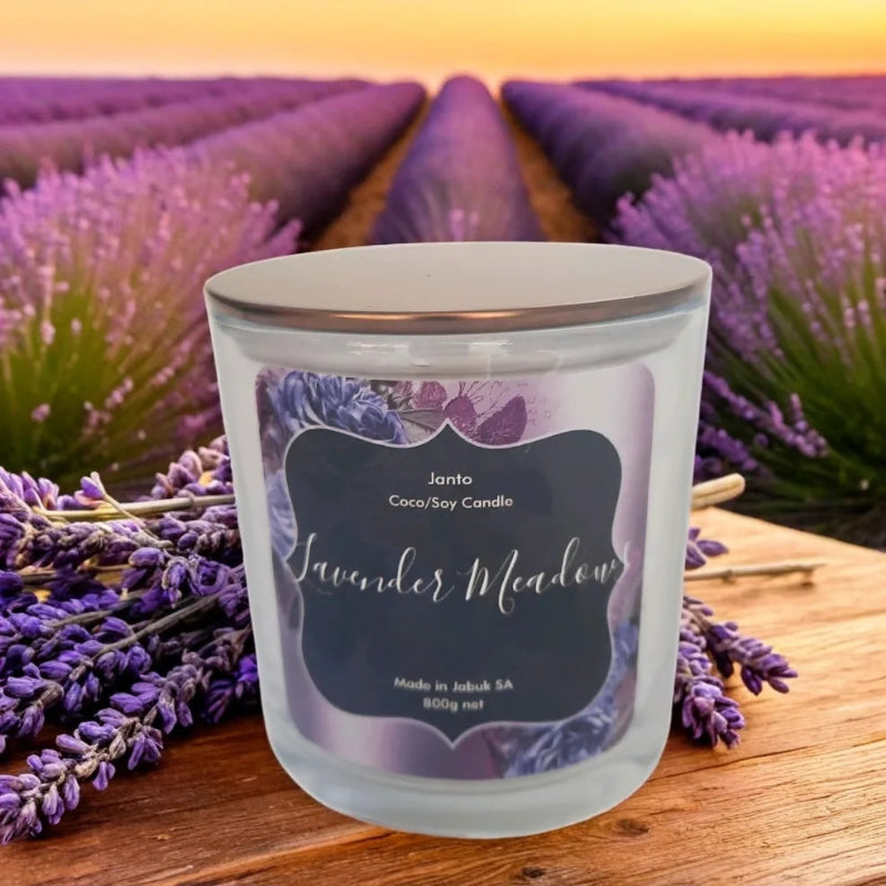 Coco soy candle with 2 cotton wicks. True aroma of lavender. Like wandering through a field of lavender. Aromas of French lavender, rosemary and warm amber. X large glass container with gold lid. 380g wax; approximately 46 hours burn time.